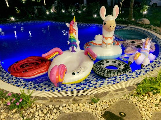 - Bể bơi ngoại trời 110m2 và phao bơi intex.